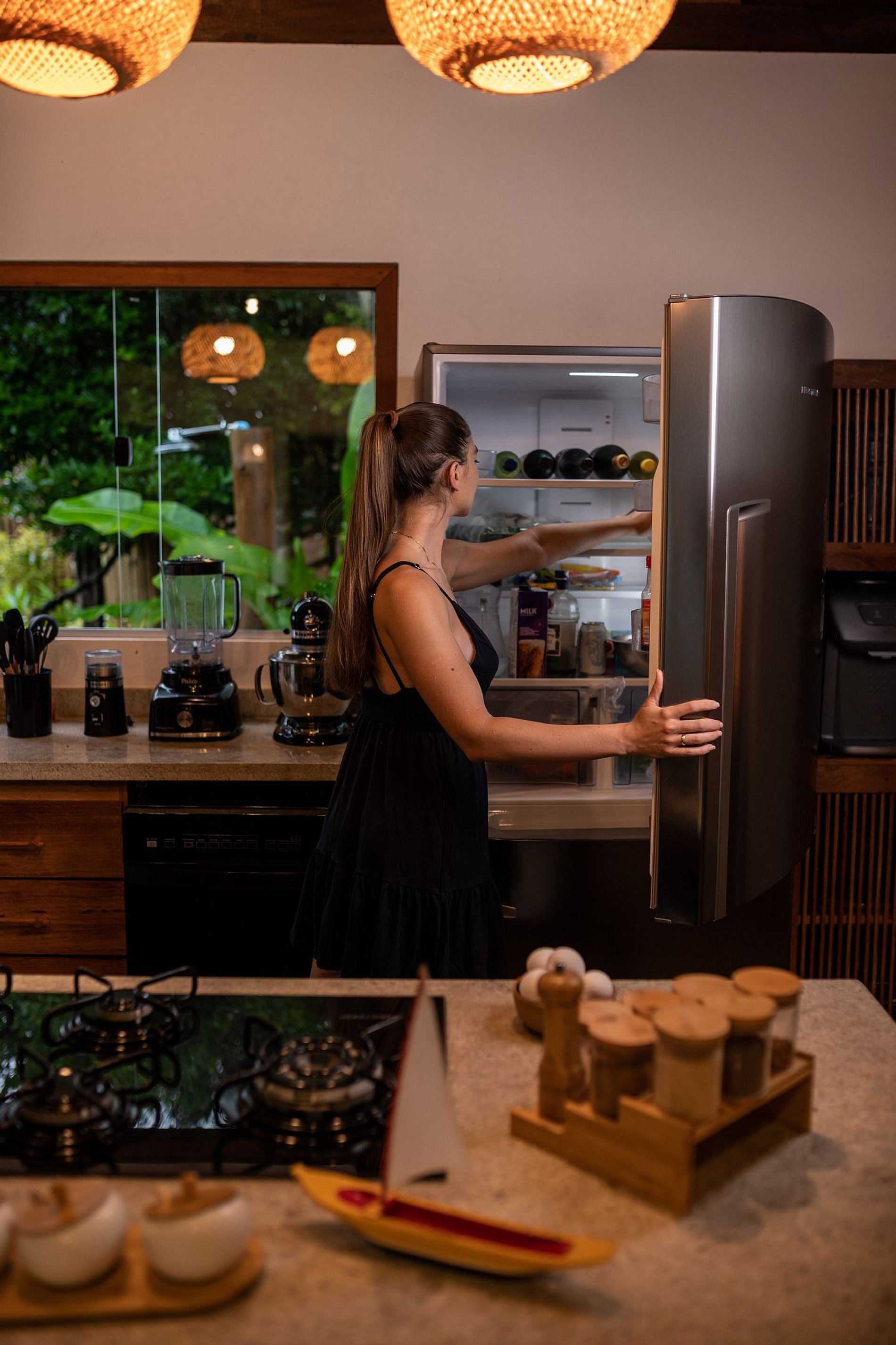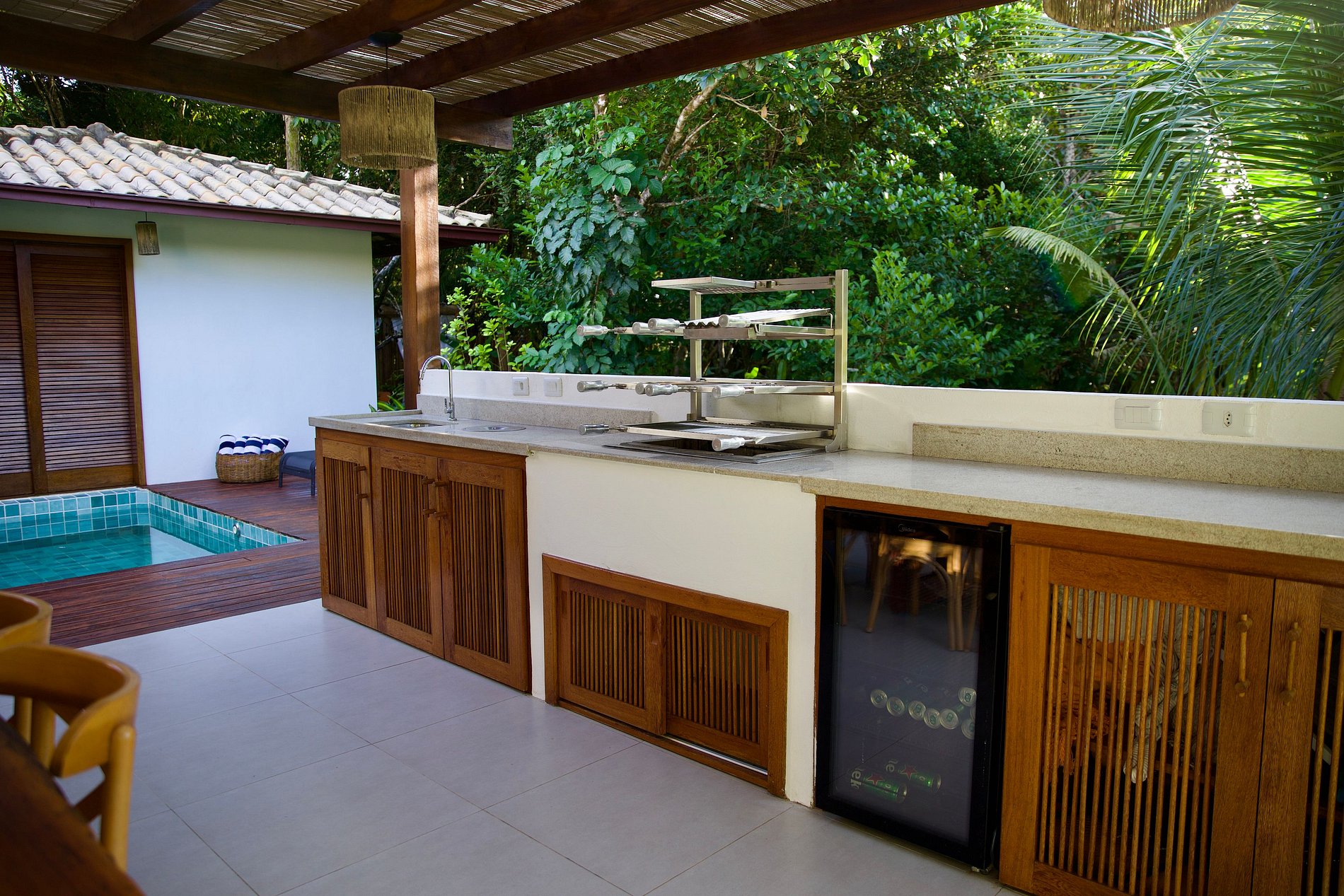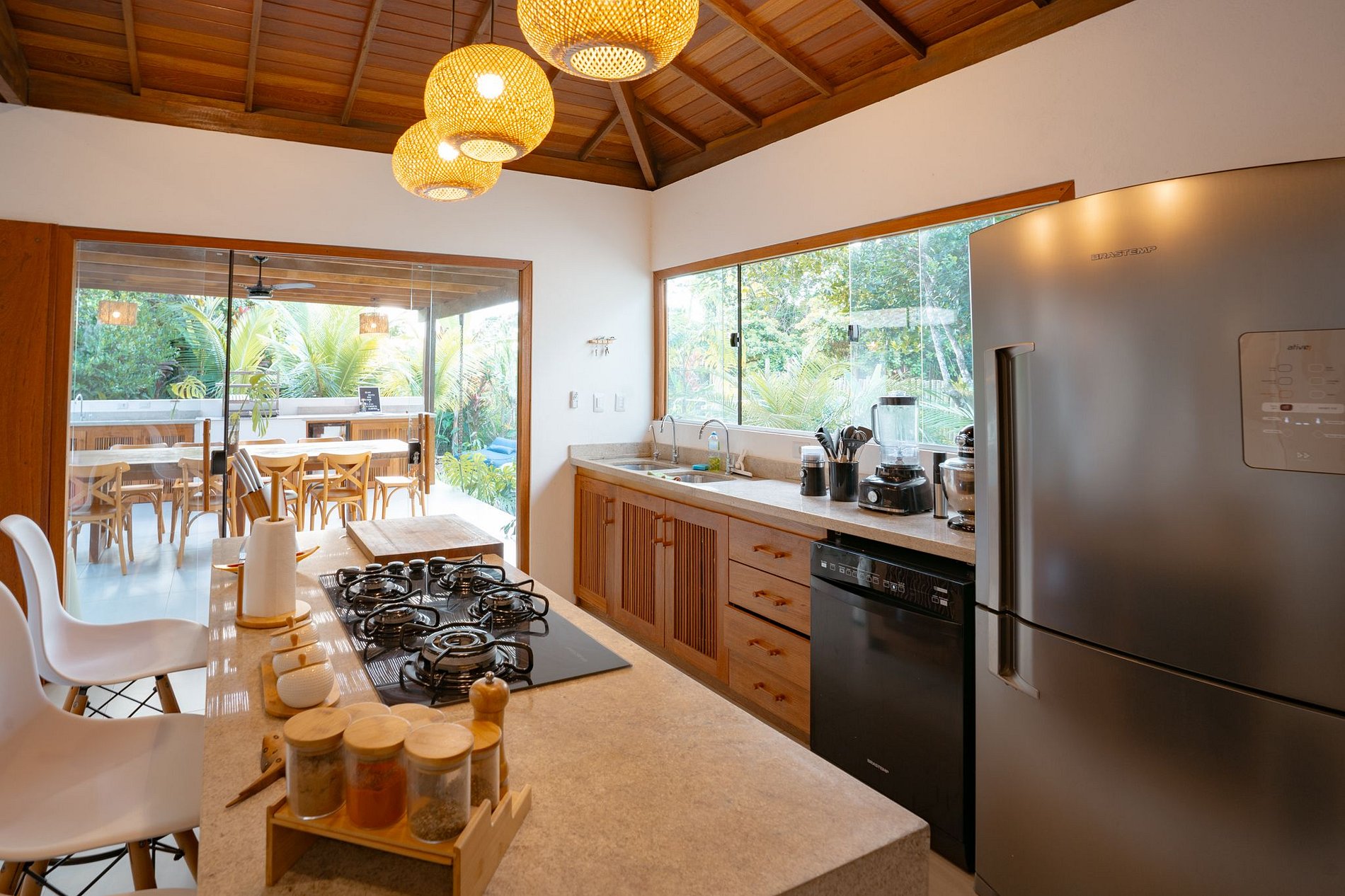 Nossa área social é espaçosa, super agradável e bem decorada, e conta com uma cozinha integrada totalmente equipada, com os melhores eletrodomésticos e utensílios: Fogão 5 bocas, Forno elétrico por convecção, Geladeira Inverse 573 litros, Máquina de lavar louças 14 serviços, Cafeteira Expresso 5x1, Forno Microondas, Sanduicheira, Air Fryer, Moedor de Café, Batedeira Kitchen Aid, Torradeira, Processador de alimentos, máquinha de Waffle, dentre outros. Sala de TV com sofá rebaixado estilo sunken, perfeito para curtir um pós-praia ou ver uma série na TV com os amigos e/ou familiares; lavabo, bancada e mesa de jantar interna para 09 pessoas e externa para 10 pessoas, varanda gourmet com churrasqueira em aço 304 com 4 estágios, cervejeira, champanheira embutida na bancada de granito, piscina com 1,5m de profundidade, quadra em grama e redário à sombra. Além disso, temos o espaço zen, nosso xodó, que é um cantinho super especial e cheio de boas energias para se meditar, praticar yoga, relaxar ou até fazer uma reunião de trabalho numa vibe diferente. Jardim com belo paisagismo e árvores frutíferas em formação, poltronas Ecoflamegarden, algumas delas podendo ser utilizadas na piscina, mesa com geleira, e tacho em aço corten para lareira, em ambiente externo.