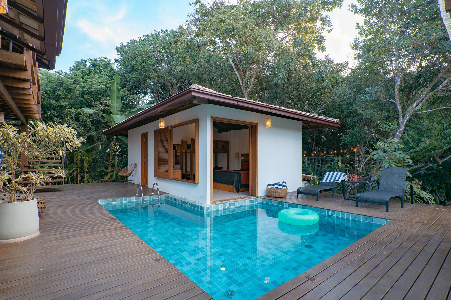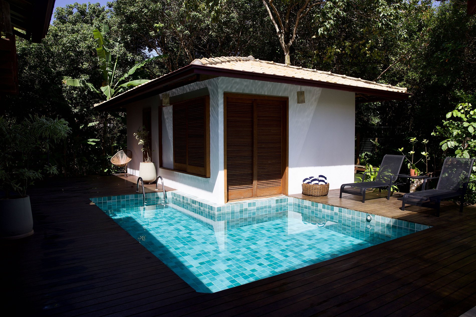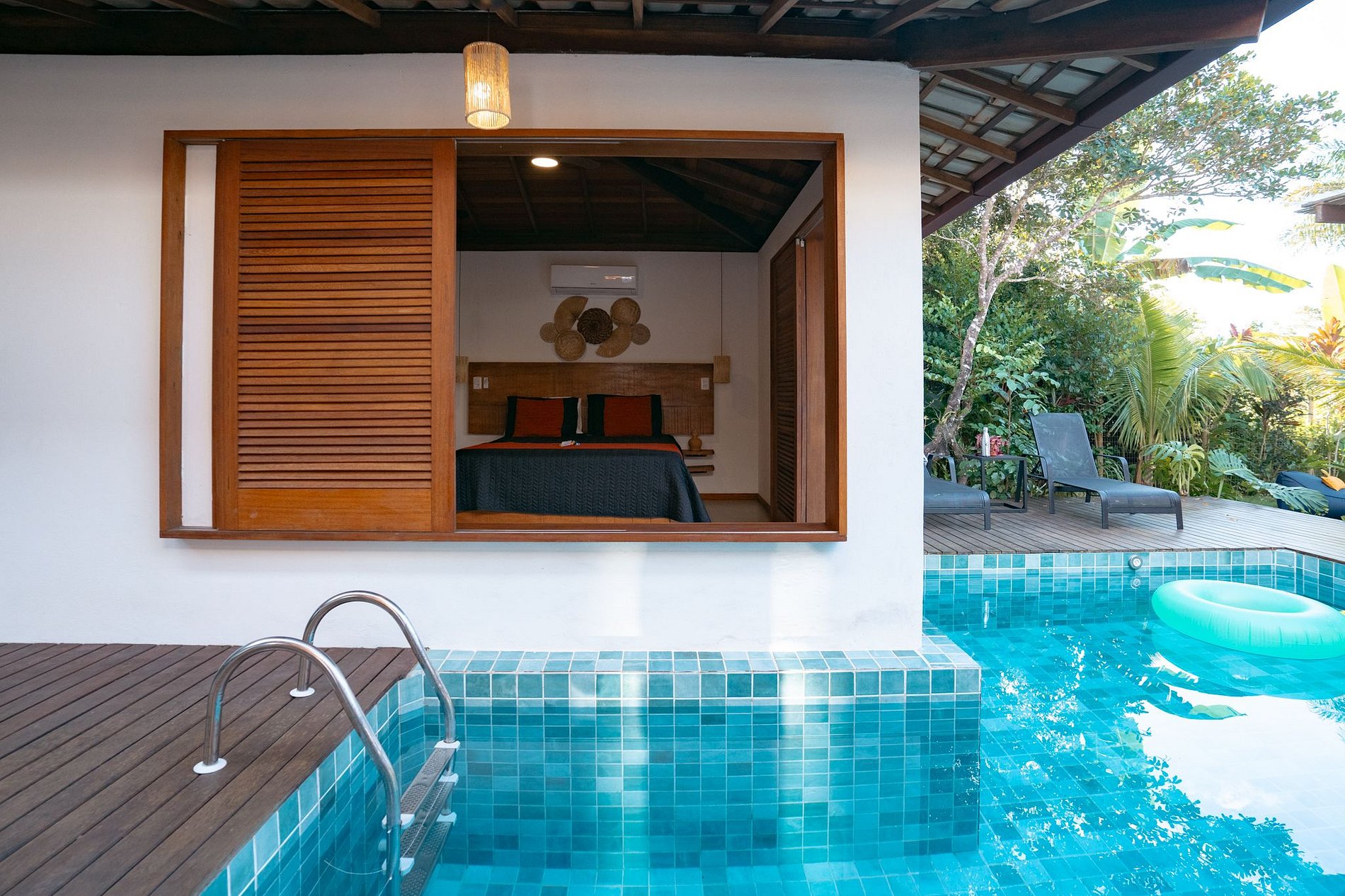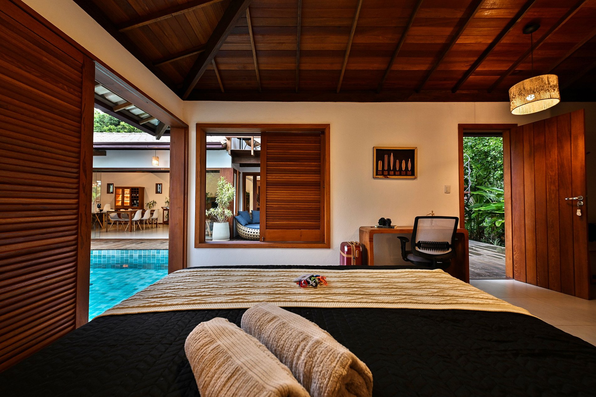 O bangalô possui uma cama queen size e duas camas auxiliares, com capacidade para receber até 4 pessoas. Possui ainda mesa de trabalho com design ergonômico e cadeira Flexform, para seu home office. Além do conforto, esta suíte tem um charme especial por estar conectada diretamente com a piscina da casa.