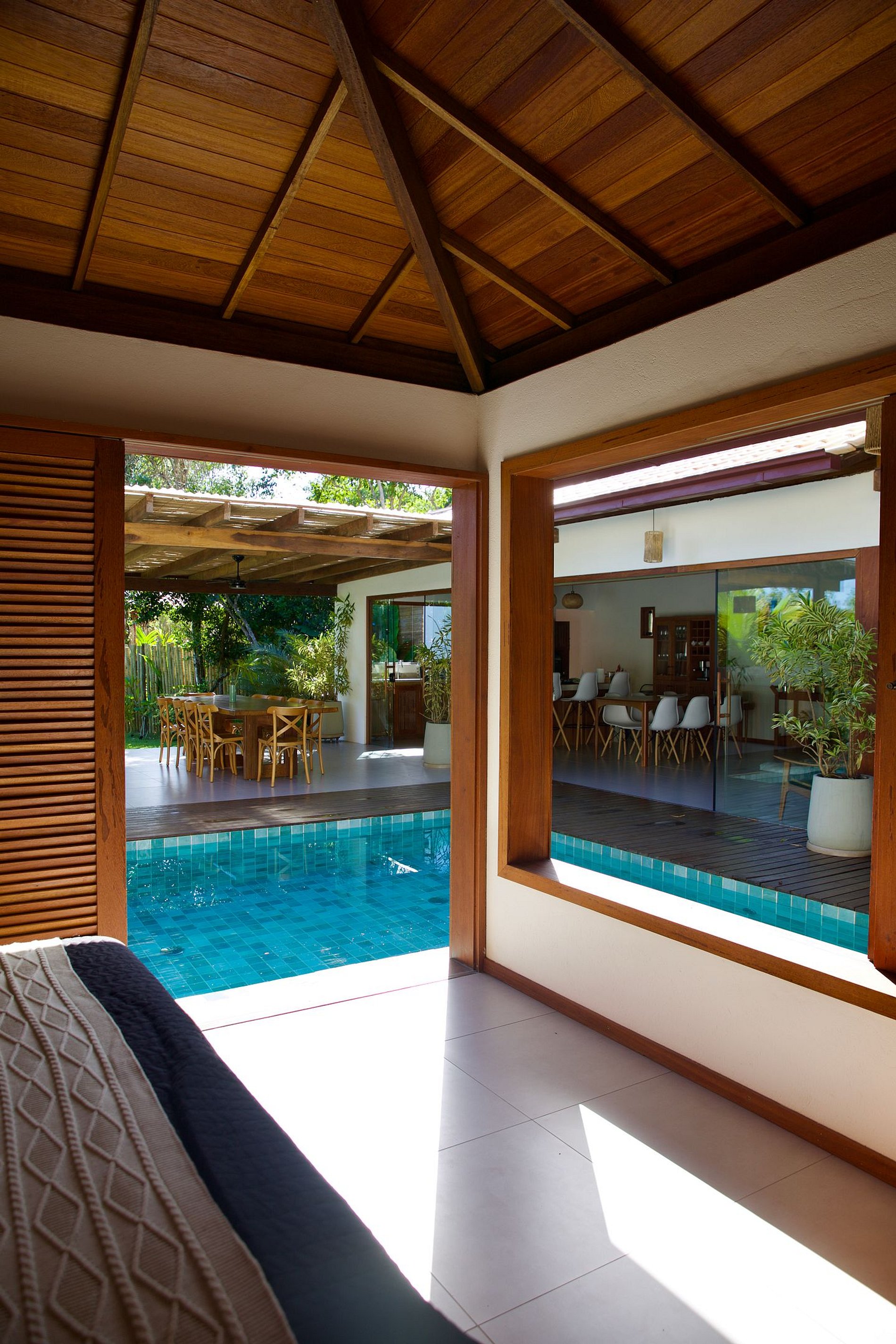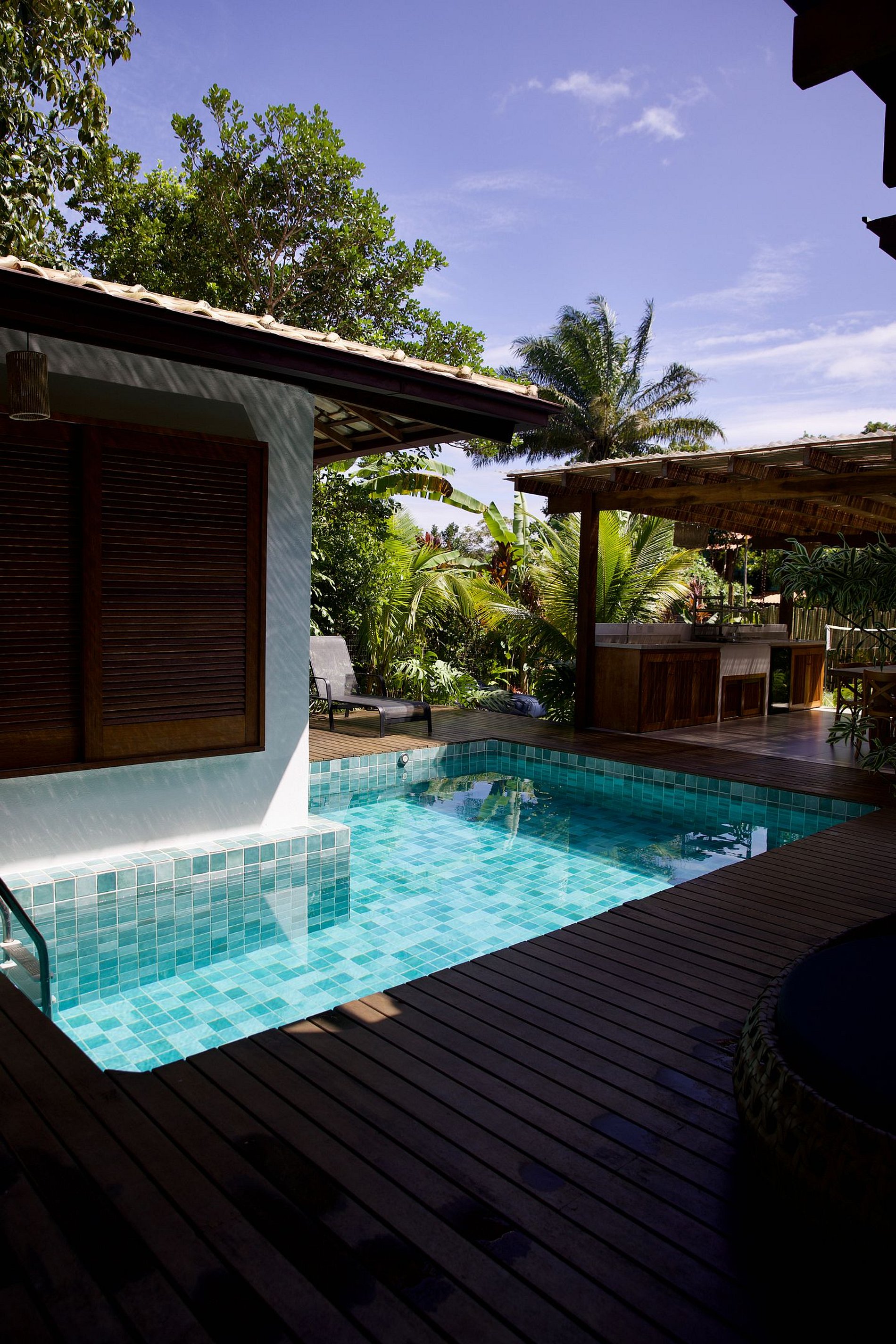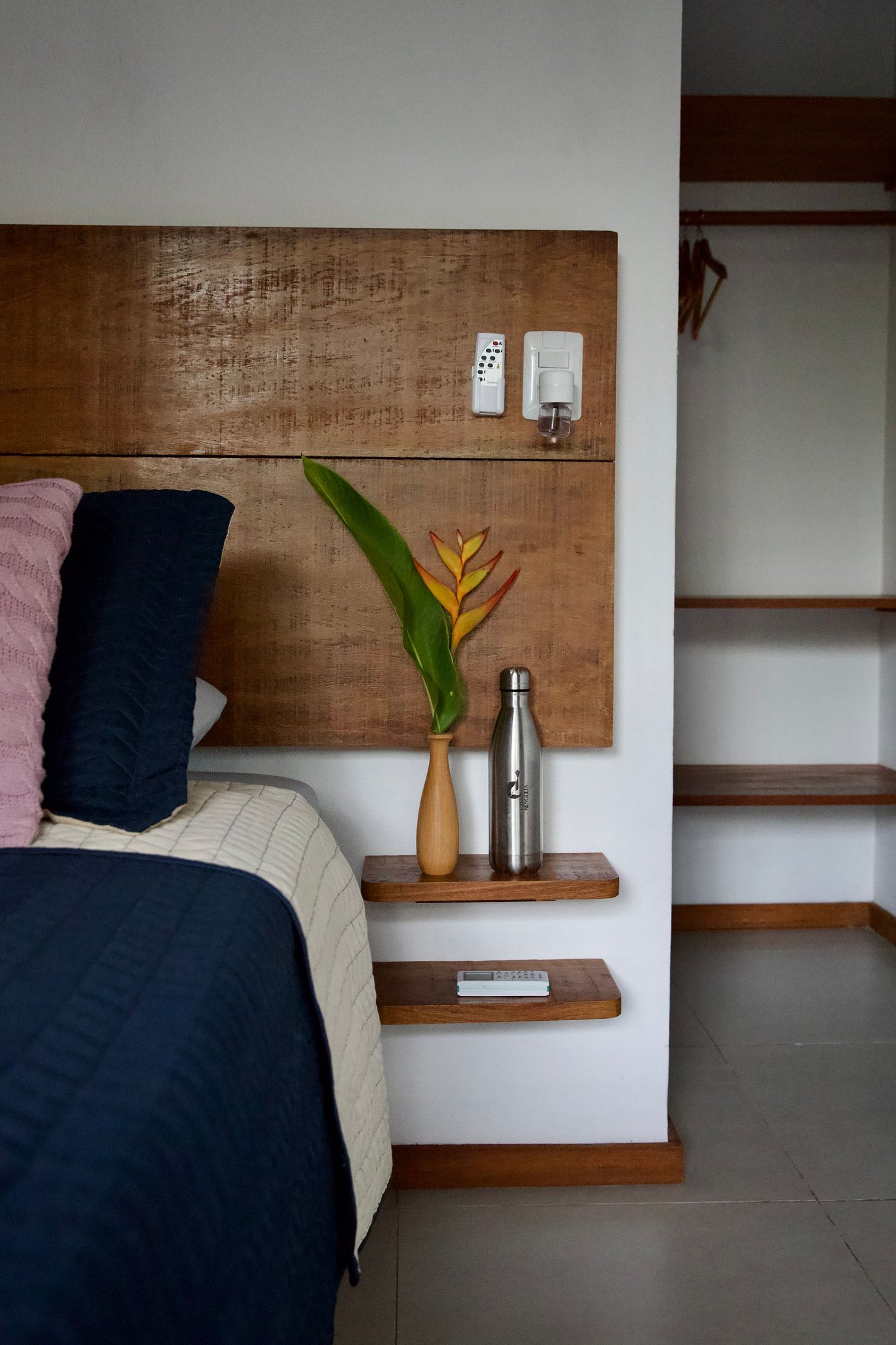 O bangalô possui uma cama queen size e duas camas auxiliares, com capacidade para receber até 4 pessoas. Possui ainda mesa de trabalho com design ergonômico e cadeira Flexform, para seu home office. Além do conforto, esta suíte tem um charme especial por estar conectada diretamente com a piscina da casa.