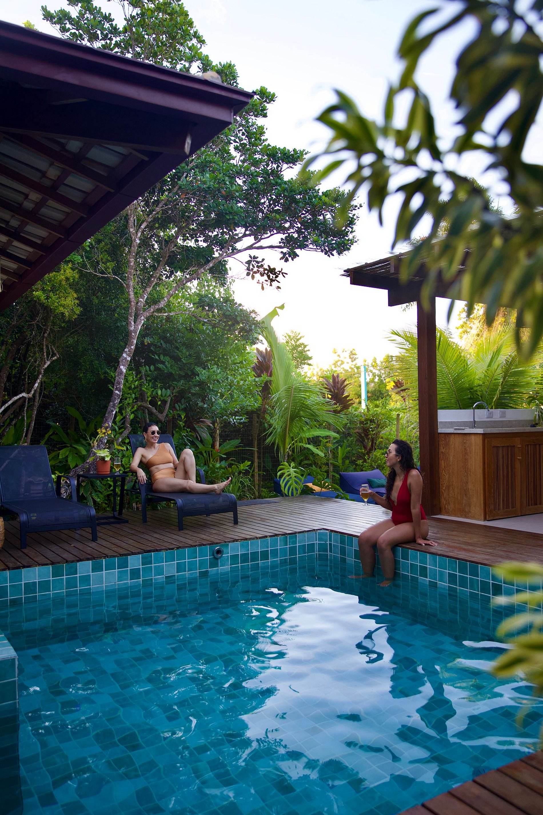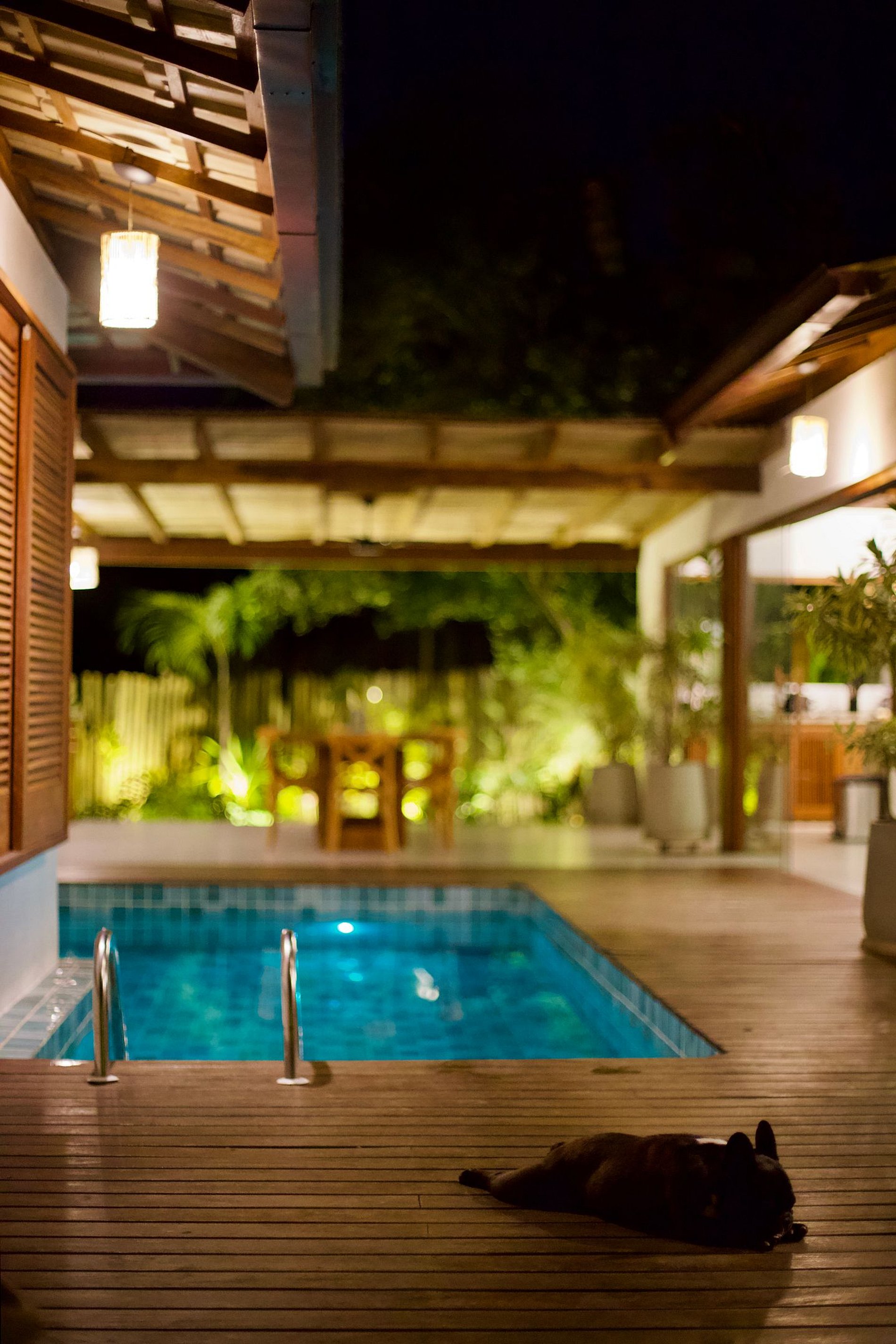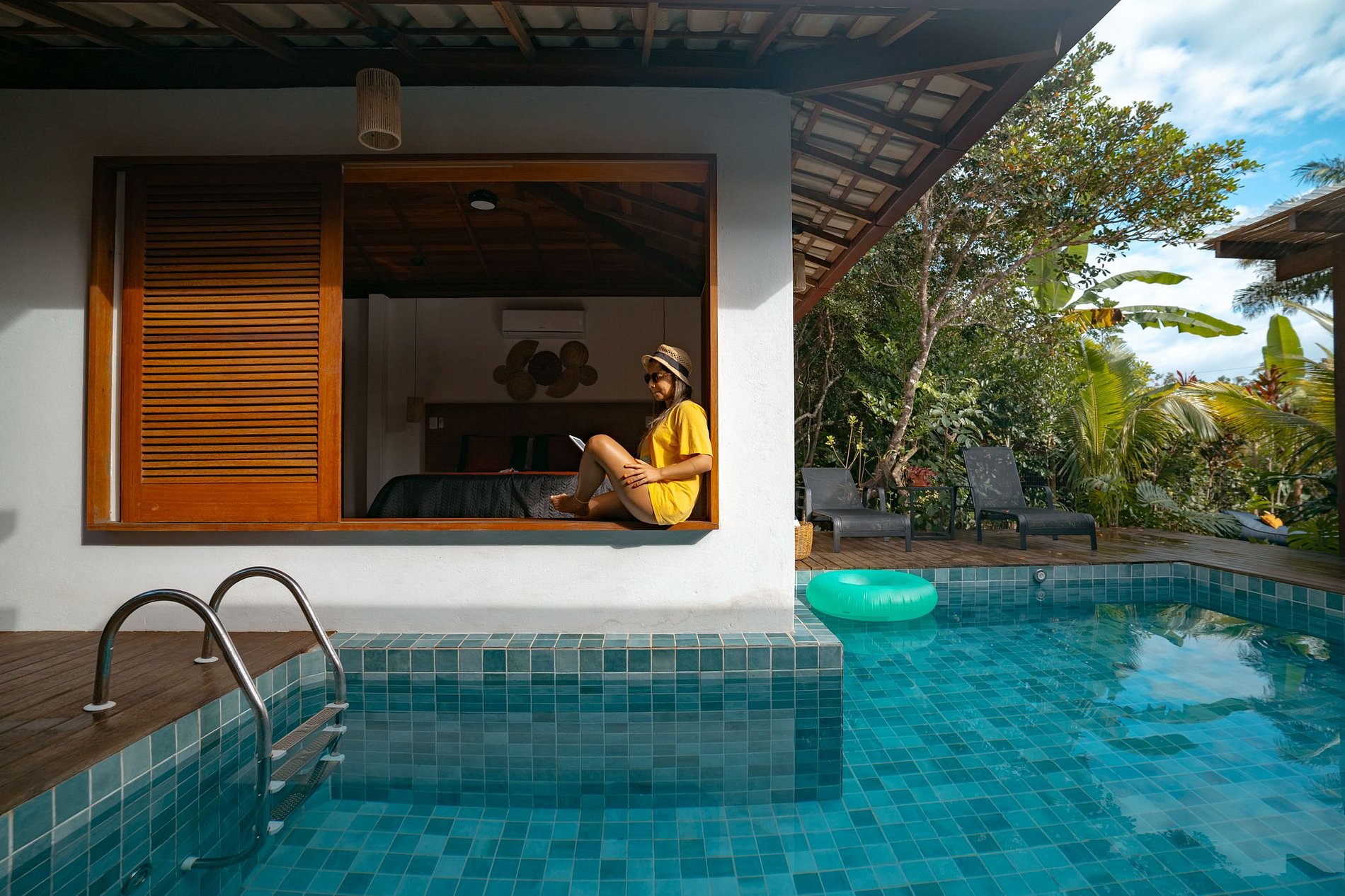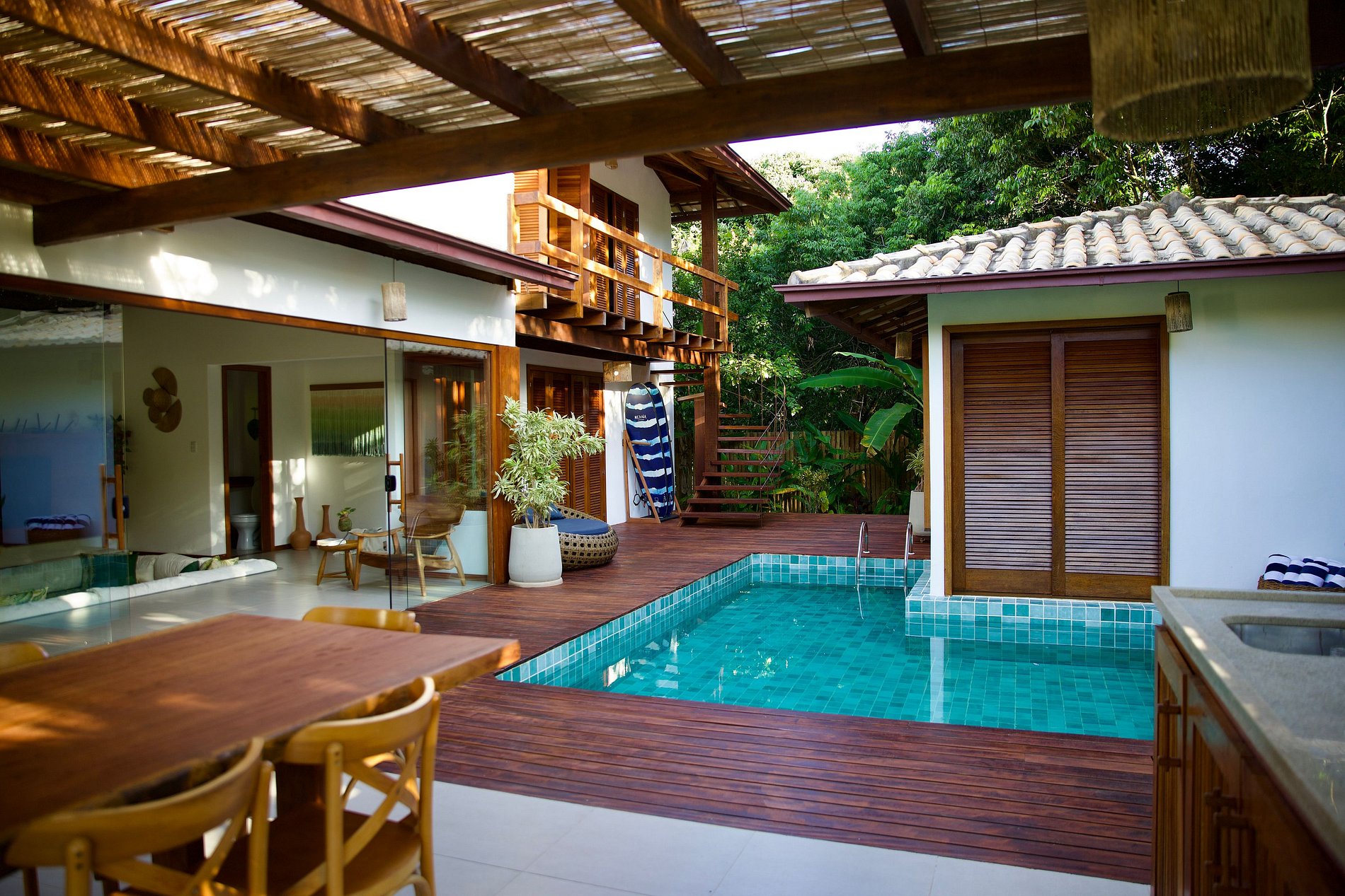 O bangalô possui uma cama queen size e duas camas auxiliares, com capacidade para receber até 4 pessoas. Possui ainda mesa de trabalho com design ergonômico e cadeira Flexform, para seu home office. Além do conforto, esta suíte tem um charme especial por estar conectada diretamente com a piscina da casa.