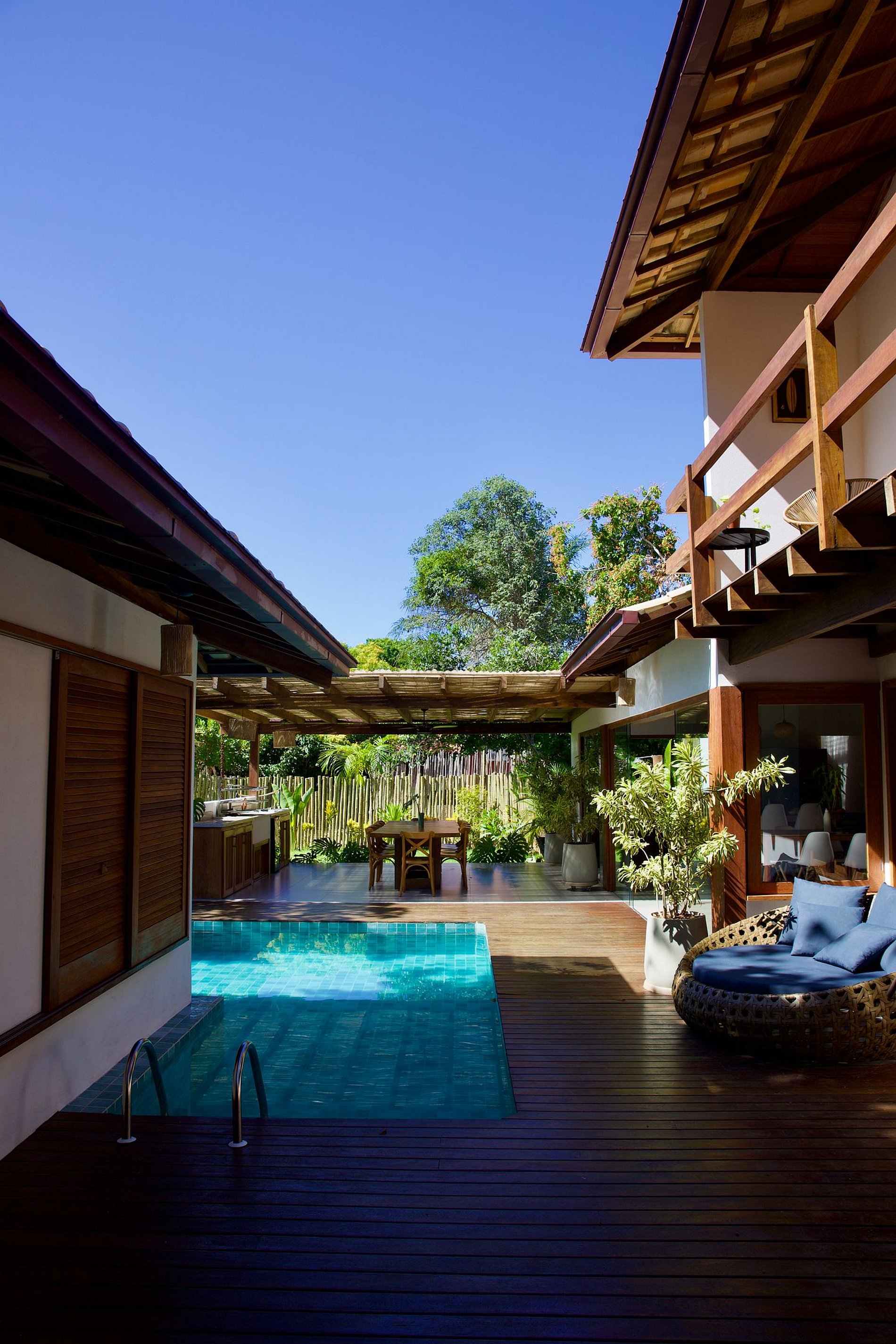 As suítes do andar superior são iguais, cada uma com cama queen size. Compartilham uma varanda agradável, com uma pequena mesa e cadeira, que se conecta visualmente com a copa das árvores, piscina, espaço gourmet e jardim.