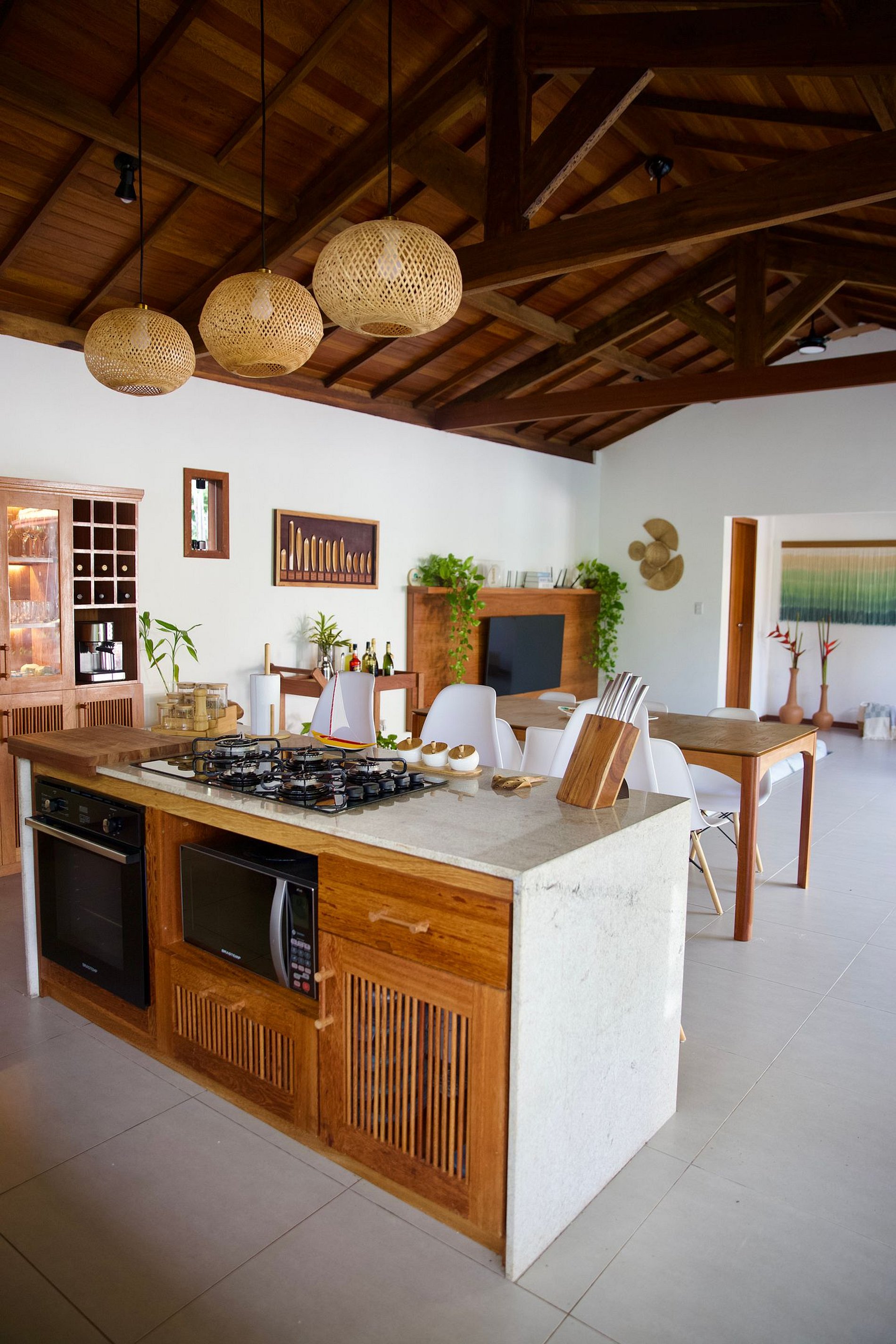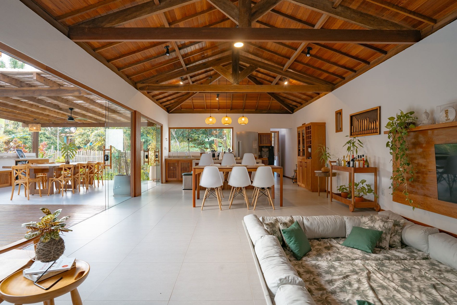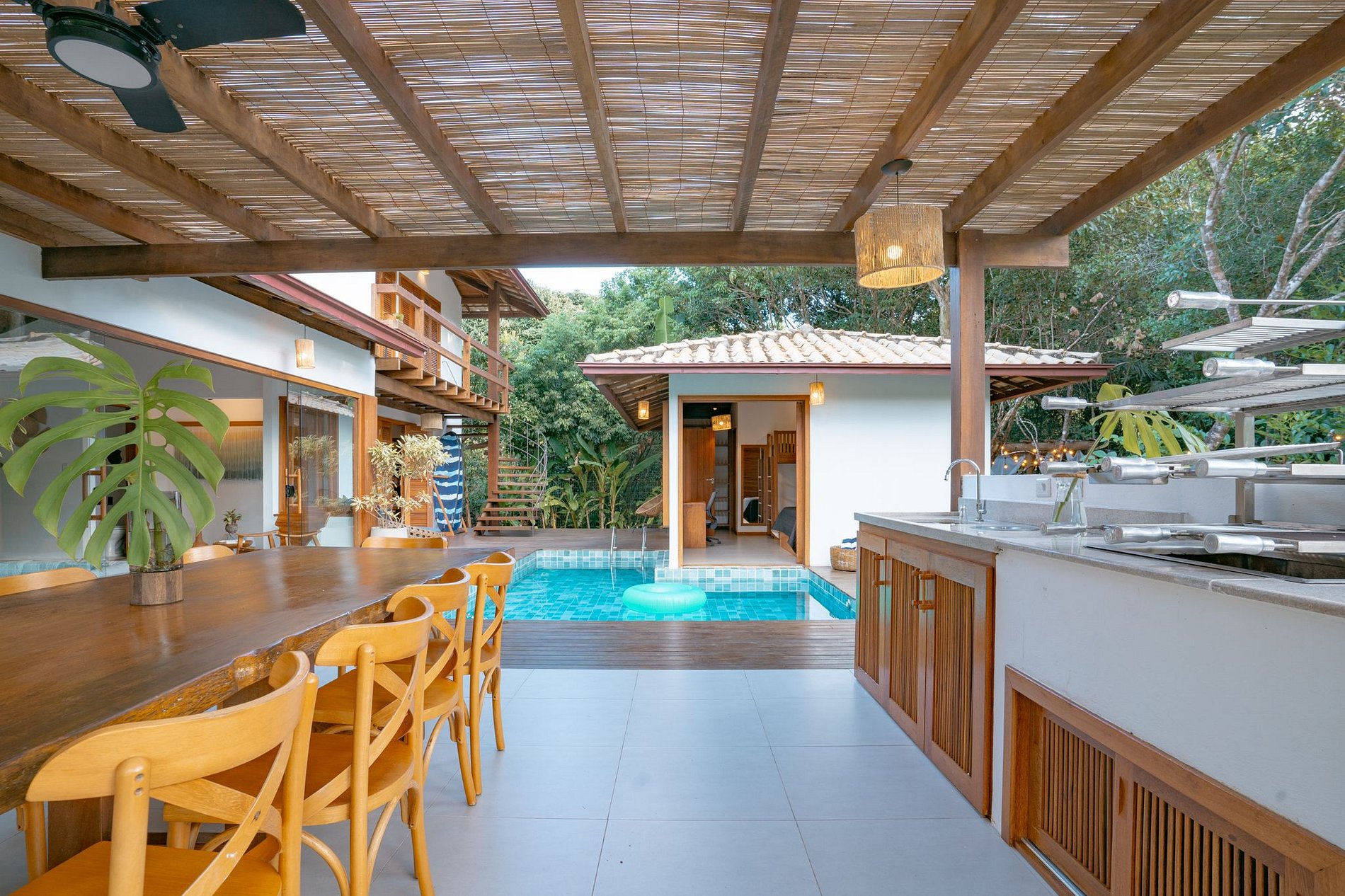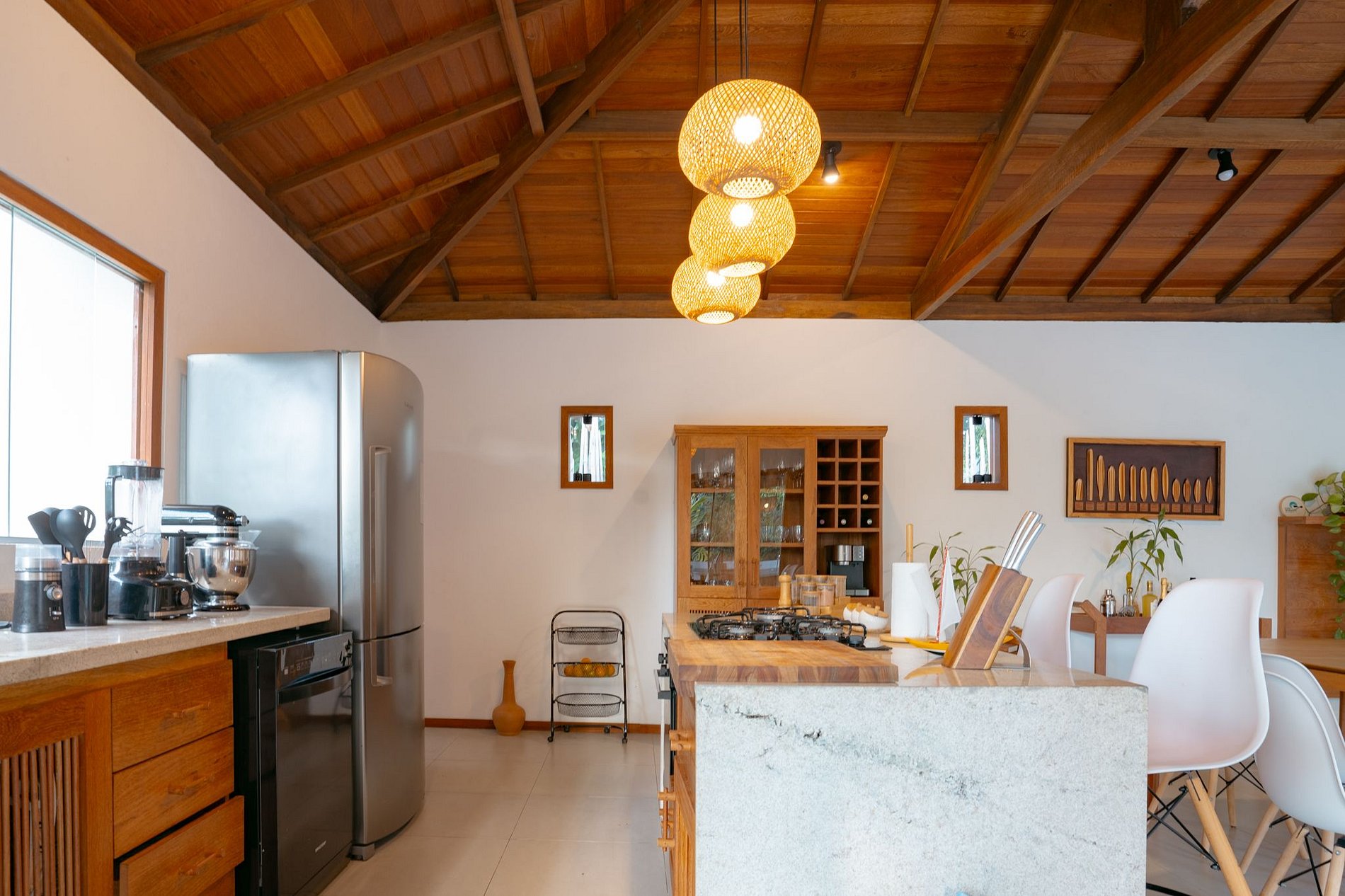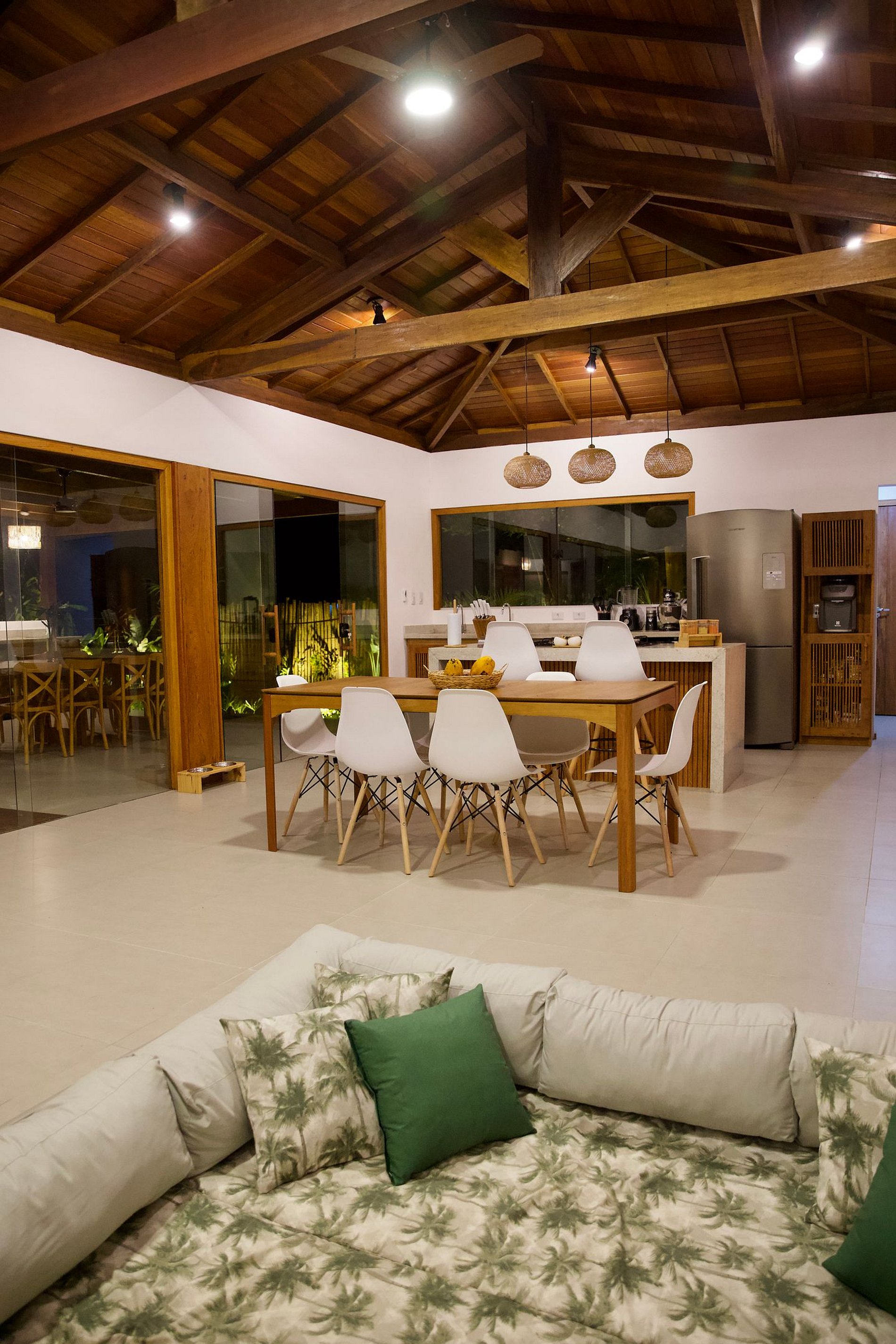 Nossa área social é espaçosa, super agradável e bem decorada, e conta com uma cozinha integrada totalmente equipada, com os melhores eletrodomésticos e utensílios: Fogão 5 bocas, Forno elétrico por convecção, Geladeira Inverse 573 litros, Máquina de lavar louças 14 serviços, Cafeteira Expresso 5x1, Forno Microondas, Sanduicheira, Air Fryer, Moedor de Café, Batedeira Kitchen Aid, Torradeira, Processador de alimentos, máquinha de Waffle, dentre outros. Sala de TV com sofá rebaixado estilo sunken, perfeito para curtir um pós-praia ou ver uma série na TV com os amigos e/ou familiares; lavabo, bancada e mesa de jantar interna para 09 pessoas e externa para 10 pessoas, varanda gourmet com churrasqueira em aço 304 com 4 estágios, cervejeira, champanheira embutida na bancada de granito, piscina com 1,5m de profundidade, quadra em grama e redário à sombra. Além disso, temos o espaço zen, nosso xodó, que é um cantinho super especial e cheio de boas energias para se meditar, praticar yoga, relaxar ou até fazer uma reunião de trabalho numa vibe diferente. Jardim com belo paisagismo e árvores frutíferas em formação, poltronas Ecoflamegarden, algumas delas podendo ser utilizadas na piscina, mesa com geleira, e tacho em aço corten para lareira, em ambiente externo.