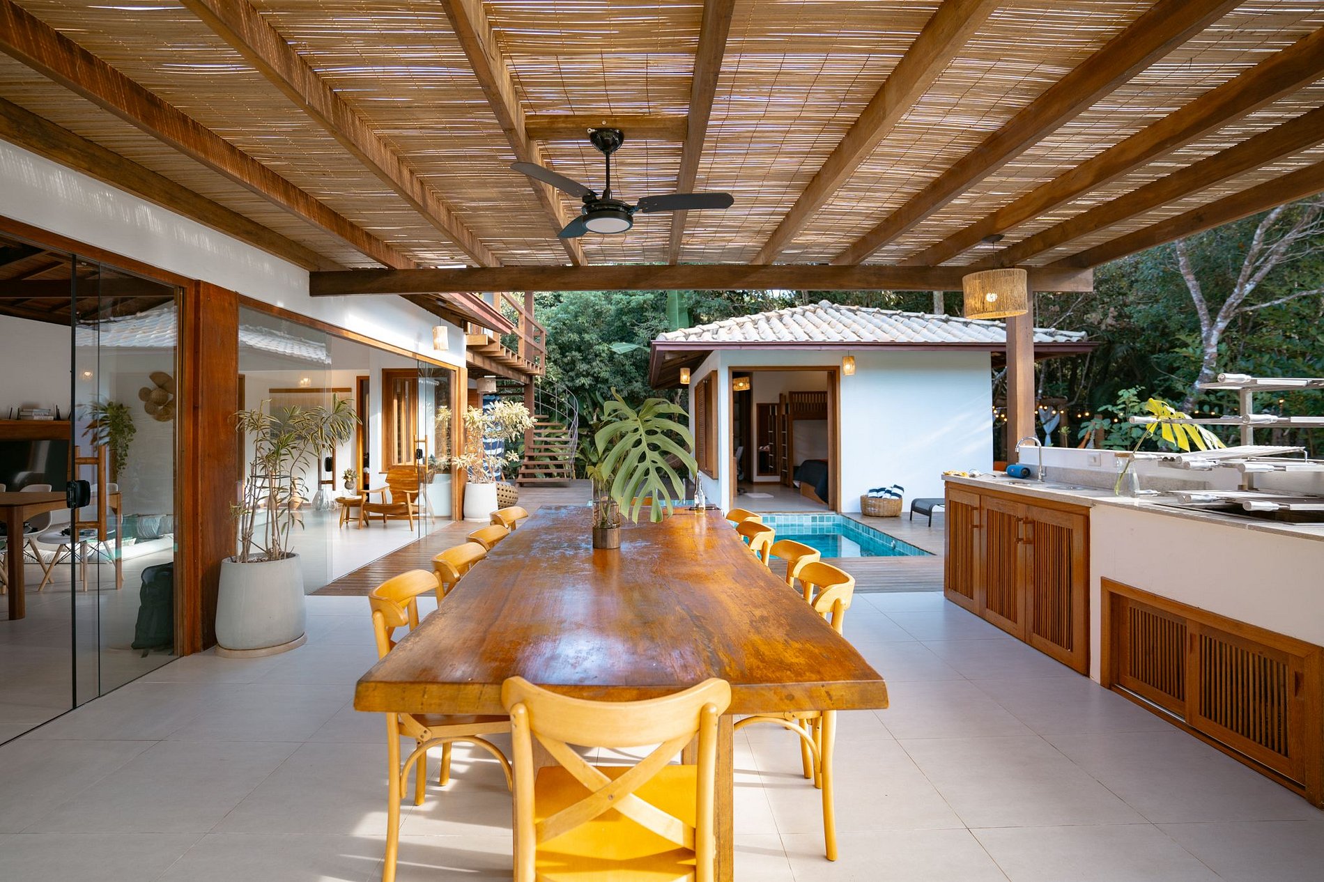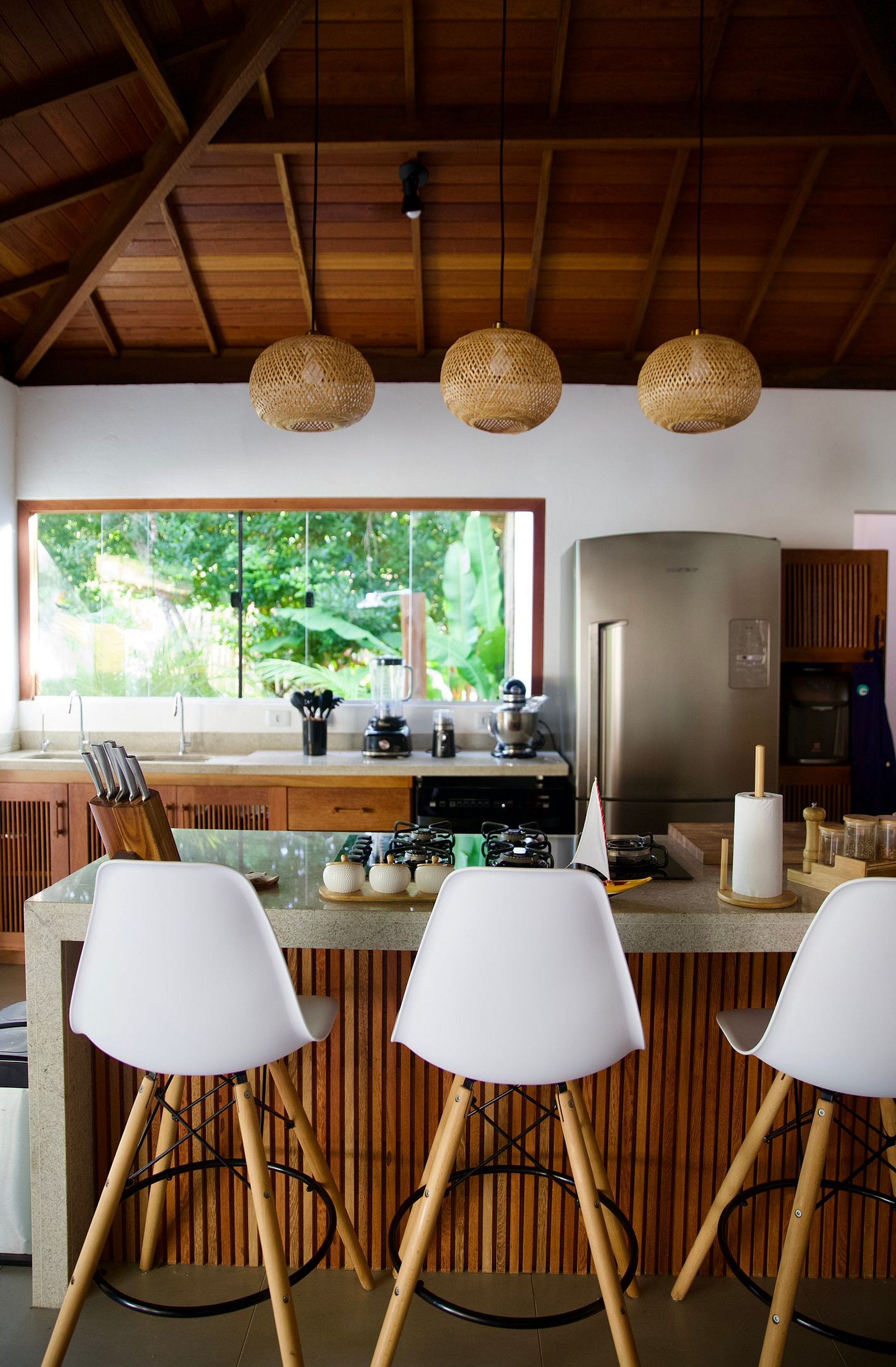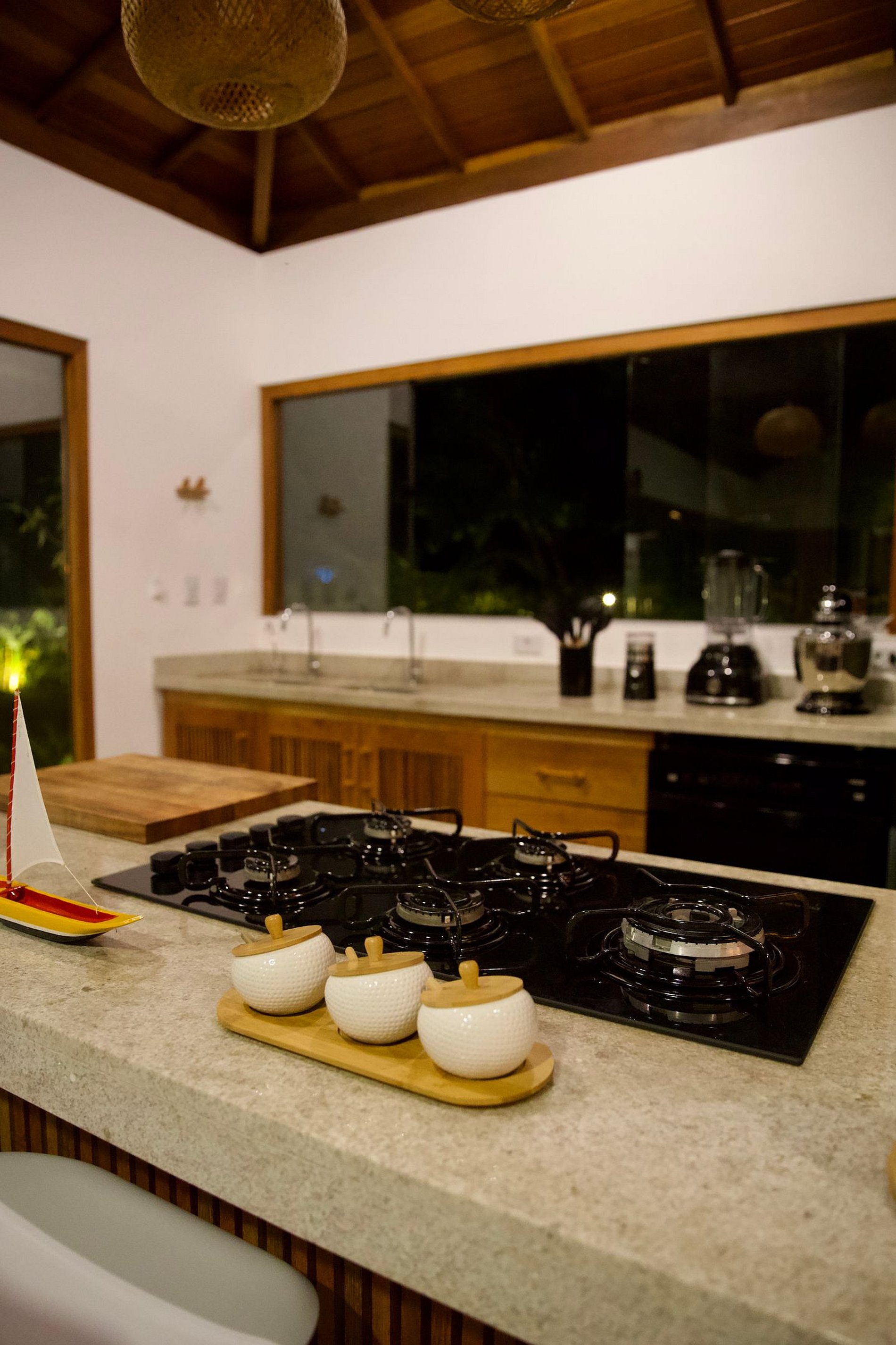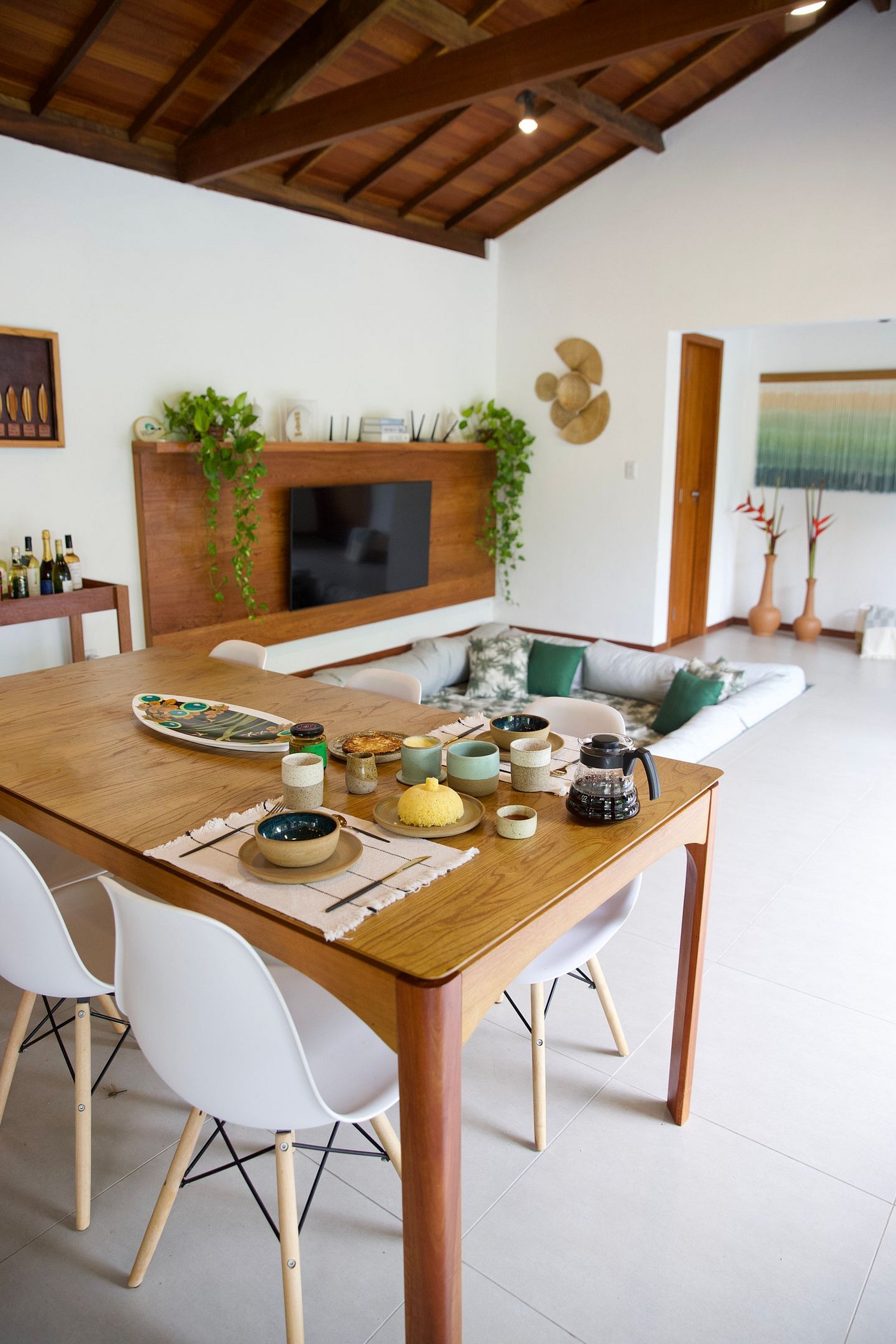 Nossa área social é espaçosa, super agradável e bem decorada, e conta com uma cozinha integrada totalmente equipada, com os melhores eletrodomésticos e utensílios: Fogão 5 bocas, Forno elétrico por convecção, Geladeira Inverse 573 litros, Máquina de lavar louças 14 serviços, Cafeteira Expresso 5x1, Forno Microondas, Sanduicheira, Air Fryer, Moedor de Café, Batedeira Kitchen Aid, Torradeira, Processador de alimentos, máquinha de Waffle, dentre outros. Sala de TV com sofá rebaixado estilo sunken, perfeito para curtir um pós-praia ou ver uma série na TV com os amigos e/ou familiares; lavabo, bancada e mesa de jantar interna para 09 pessoas e externa para 10 pessoas, varanda gourmet com churrasqueira em aço 304 com 4 estágios, cervejeira, champanheira embutida na bancada de granito, piscina com 1,5m de profundidade, quadra em grama e redário à sombra. Além disso, temos o espaço zen, nosso xodó, que é um cantinho super especial e cheio de boas energias para se meditar, praticar yoga, relaxar ou até fazer uma reunião de trabalho numa vibe diferente. Jardim com belo paisagismo e árvores frutíferas em formação, poltronas Ecoflamegarden, algumas delas podendo ser utilizadas na piscina, mesa com geleira, e tacho em aço corten para lareira, em ambiente externo.