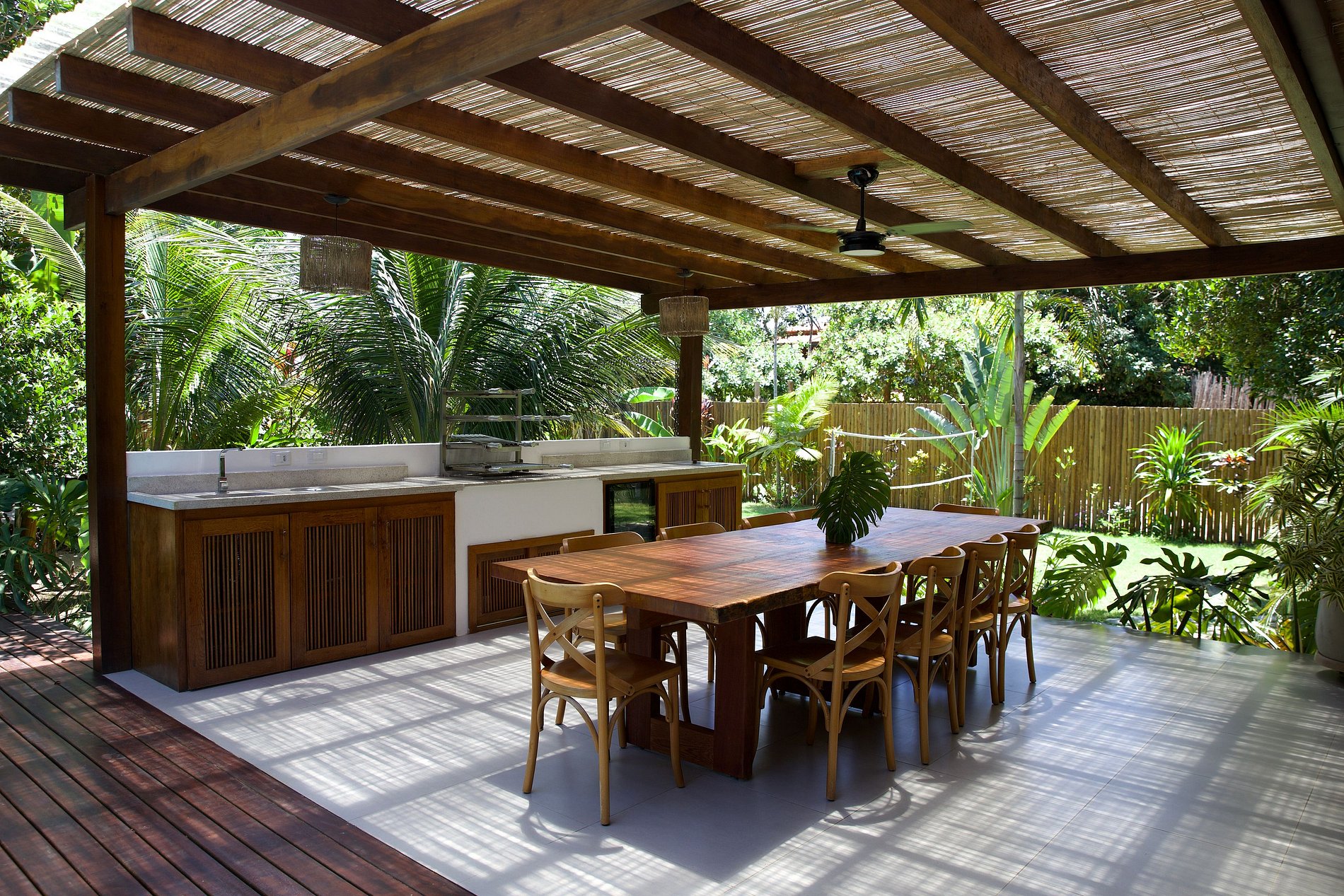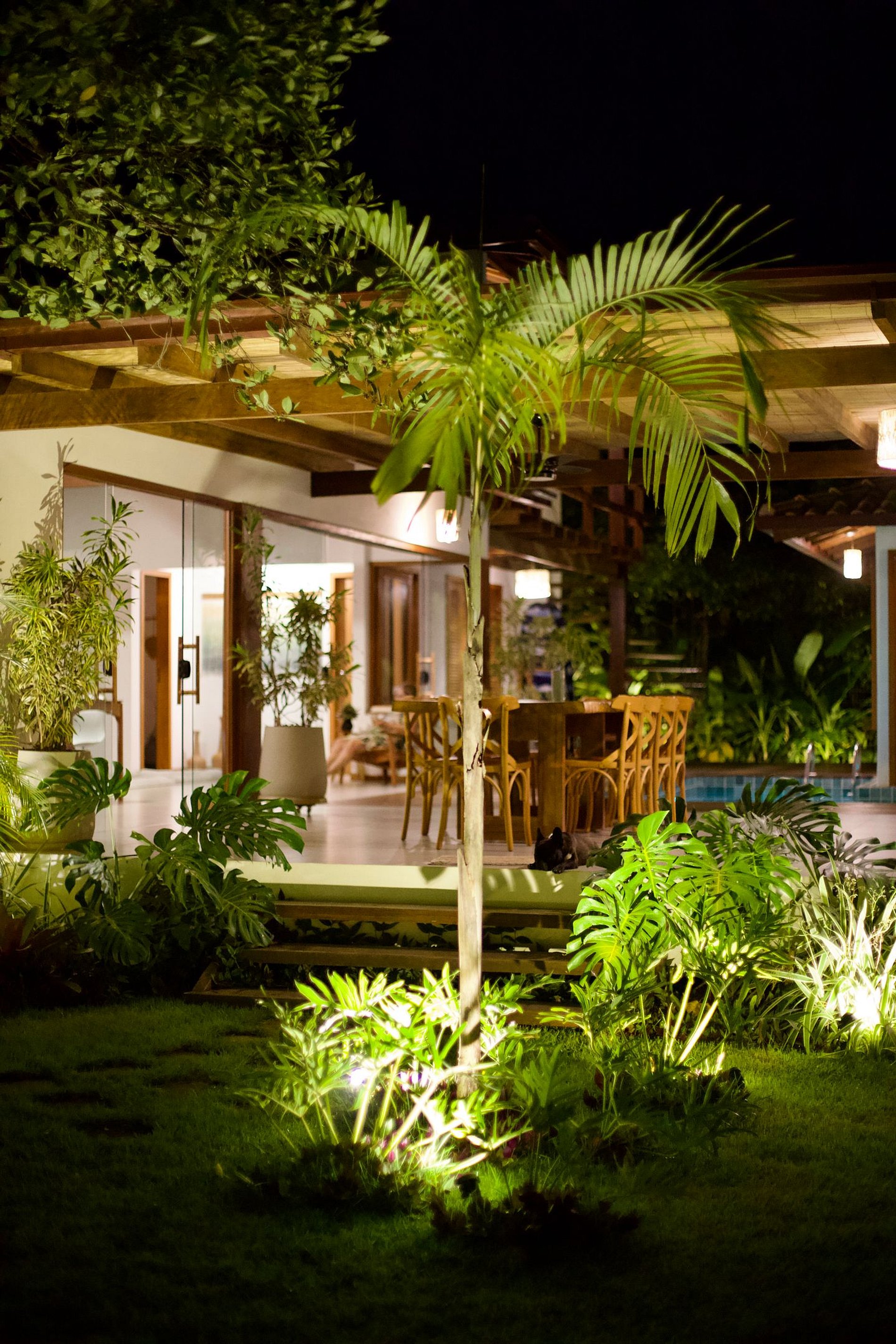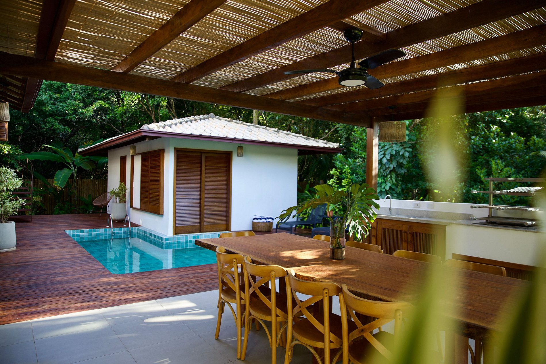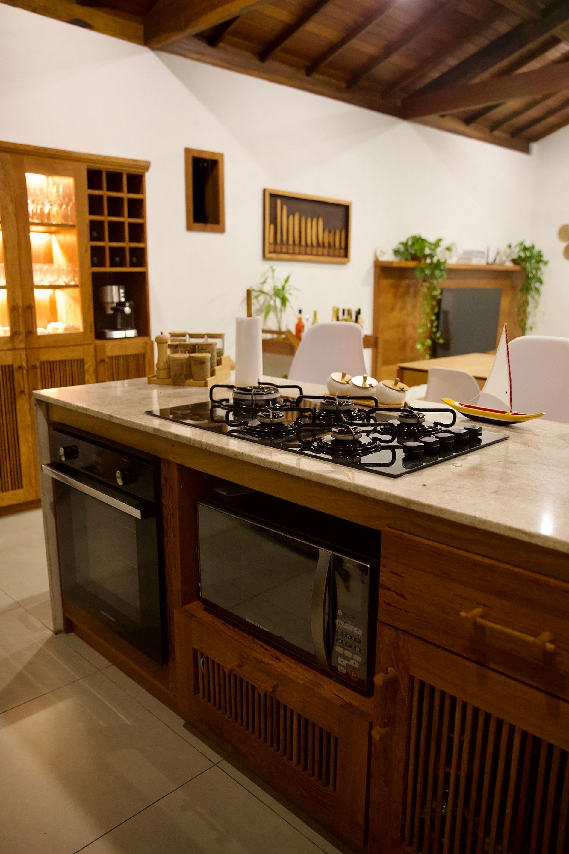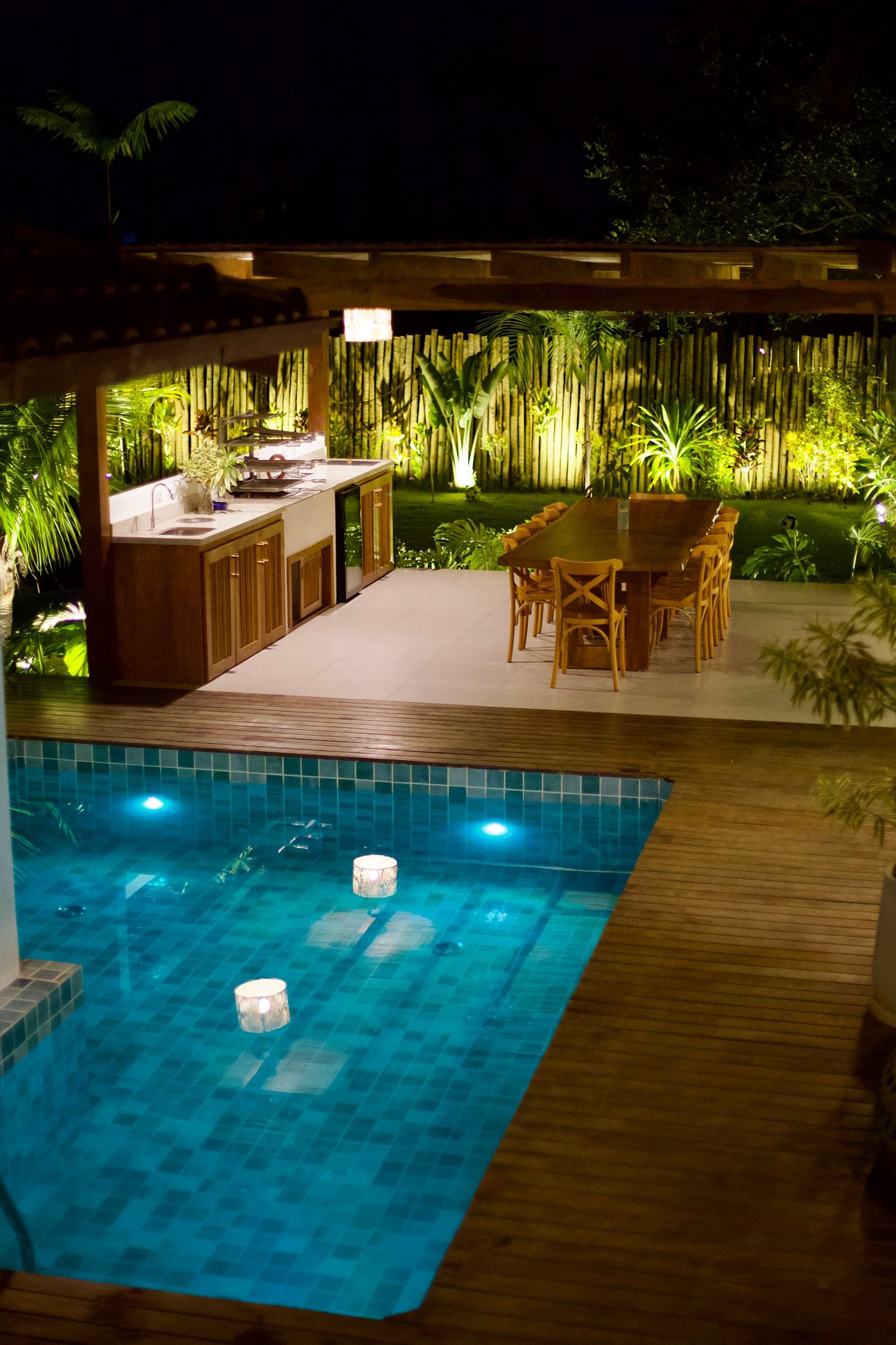 Nossa área social é espaçosa, super agradável e bem decorada, e conta com uma cozinha integrada totalmente equipada, com os melhores eletrodomésticos e utensílios: Fogão 5 bocas, Forno elétrico por convecção, Geladeira Inverse 573 litros, Máquina de lavar louças 14 serviços, Cafeteira Expresso 5x1, Forno Microondas, Sanduicheira, Air Fryer, Moedor de Café, Batedeira Kitchen Aid, Torradeira, Processador de alimentos, máquinha de Waffle, dentre outros. Sala de TV com sofá rebaixado estilo sunken, perfeito para curtir um pós-praia ou ver uma série na TV com os amigos e/ou familiares; lavabo, bancada e mesa de jantar interna para 09 pessoas e externa para 10 pessoas, varanda gourmet com churrasqueira em aço 304 com 4 estágios, cervejeira, champanheira embutida na bancada de granito, piscina com 1,5m de profundidade, quadra em grama e redário à sombra. Além disso, temos o espaço zen, nosso xodó, que é um cantinho super especial e cheio de boas energias para se meditar, praticar yoga, relaxar ou até fazer uma reunião de trabalho numa vibe diferente. Jardim com belo paisagismo e árvores frutíferas em formação, poltronas Ecoflamegarden, algumas delas podendo ser utilizadas na piscina, mesa com geleira, e tacho em aço corten para lareira, em ambiente externo.