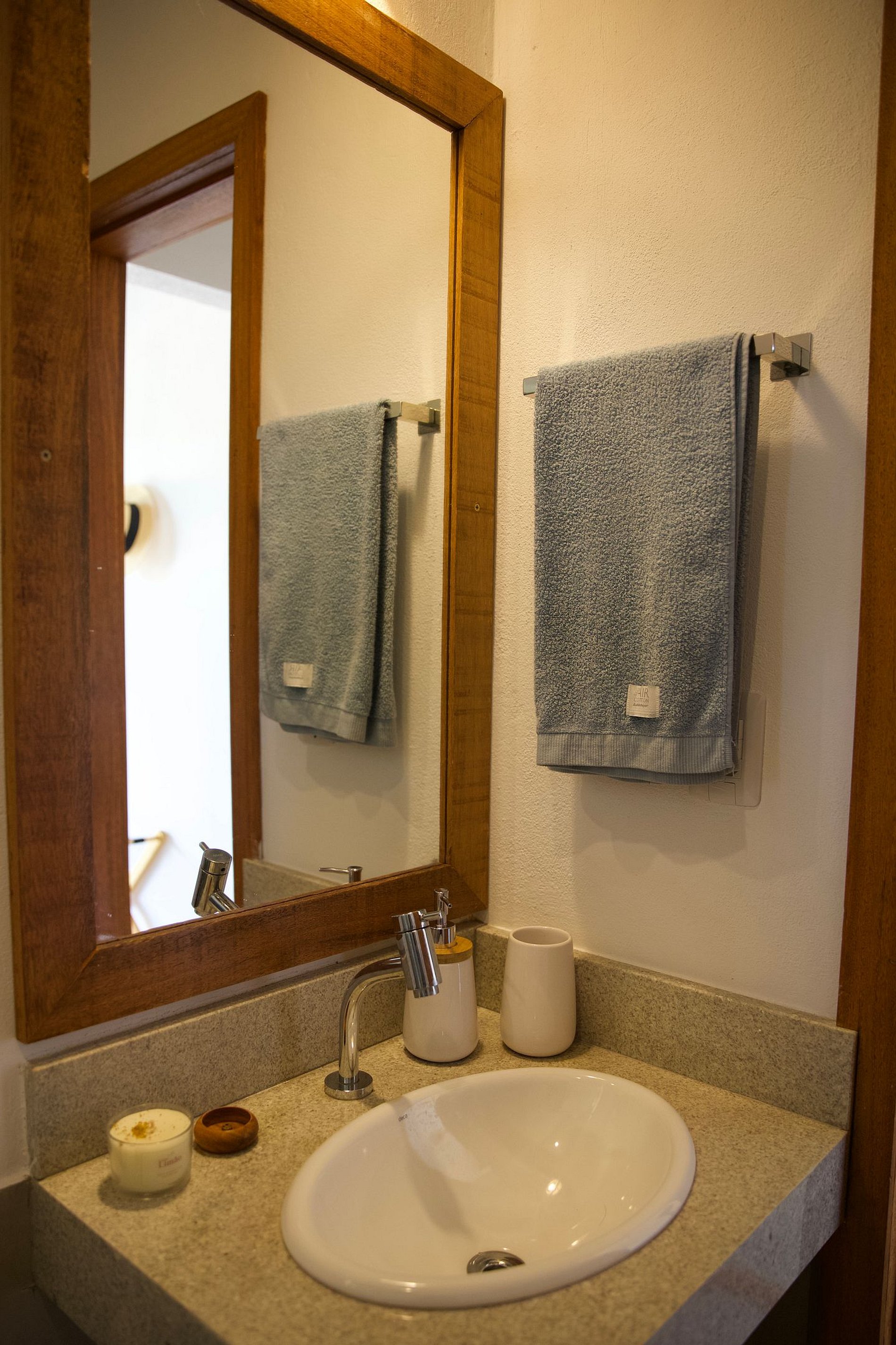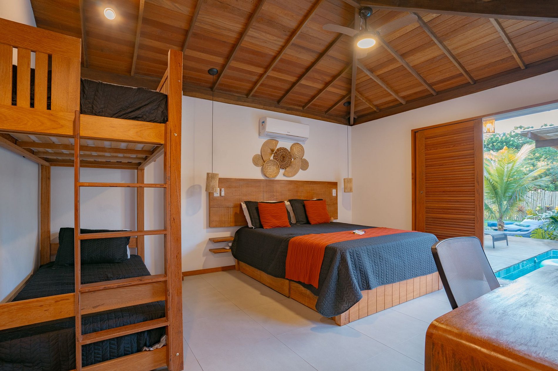 A outra suíte térrea, também ampla, possui uma cama queen size e duas camas auxiliares, além de um amplo banheiro que divide área molhada e seca. Preparada para receber até 4 pessoas, apresenta ainda um roupeiro para que os hóspedes organizem melhor seus pertences, durante a estadia.