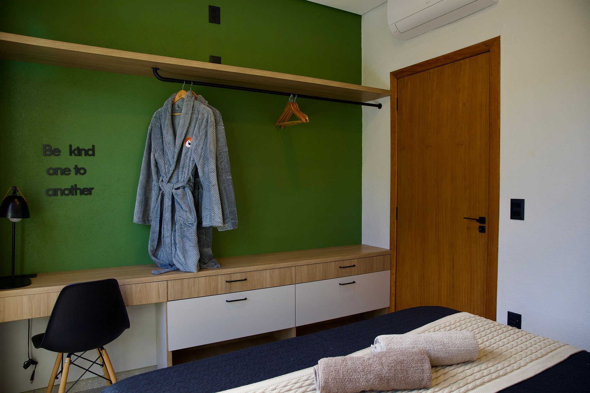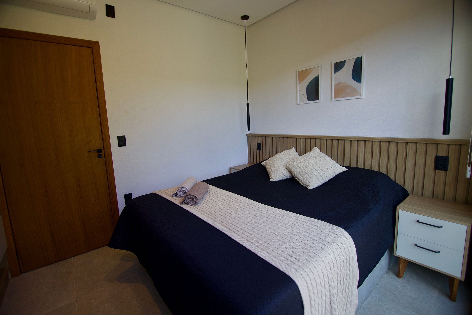 - Quarto:Equipado com cama queen com colchão de molas ensacadas Guldi, móveis planejados sob medida e uma mesa de trabalho perfeita para o home office.