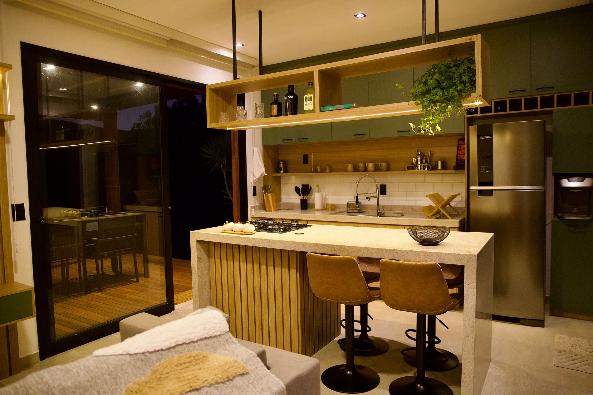 - Cozinha:Integrada à sala, perfeita para quem gosta de cozinhar, é super equipada com eletrodomésticos e utensílios de qualidade, incluindo geladeira, cooktop e forno Brastemp, microondas, airfryer, liquidificador, mixer, torradeira, moedor de café, cepo de facas James F, kit homebar, copos, taças, louças de cerâmica, dentre outros. A ilha tem bancada para até 4 pessoas.