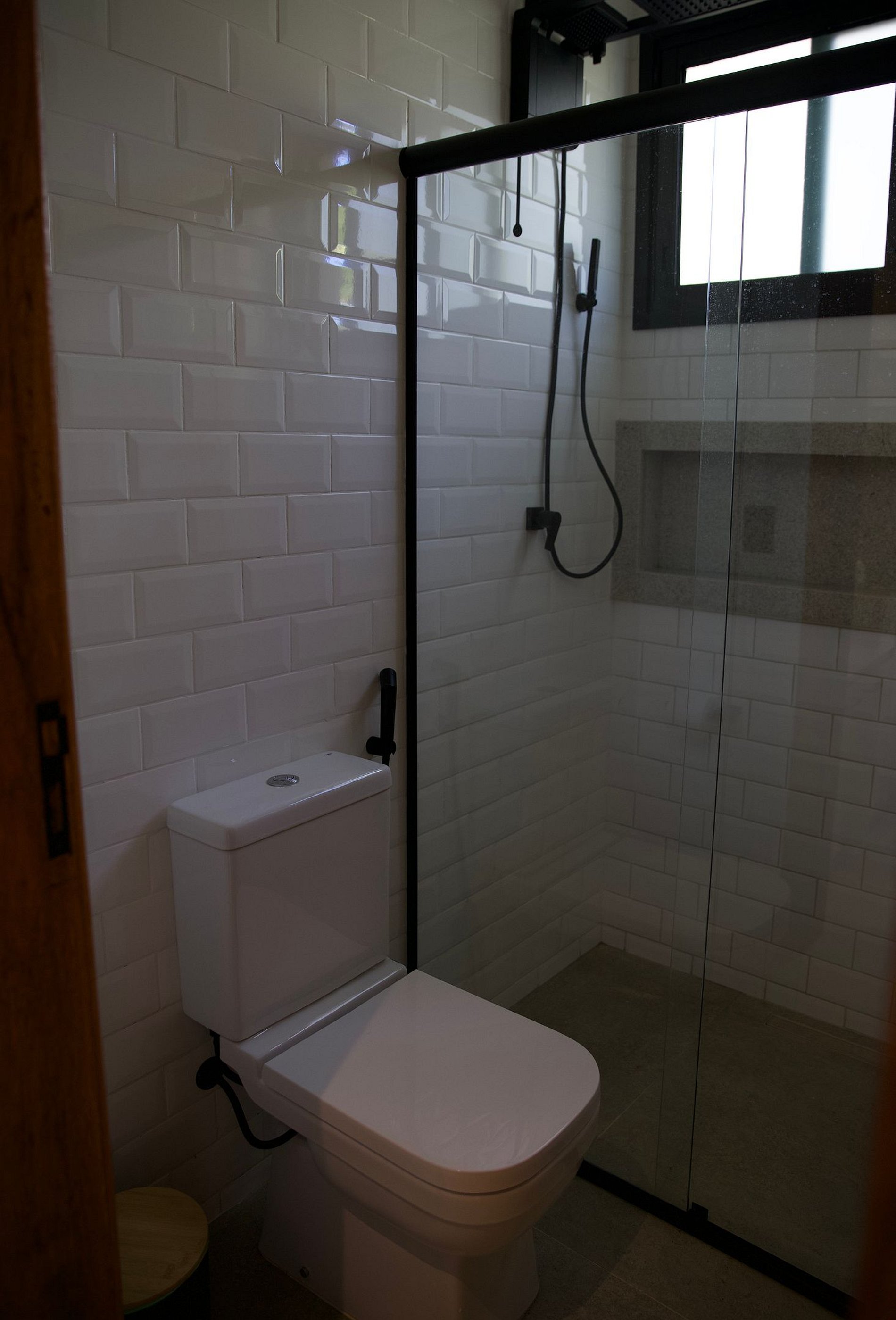 - Banheiro: Possui áreas molhada e seca separadas, com armários sob medida e chuveiro elétrico.