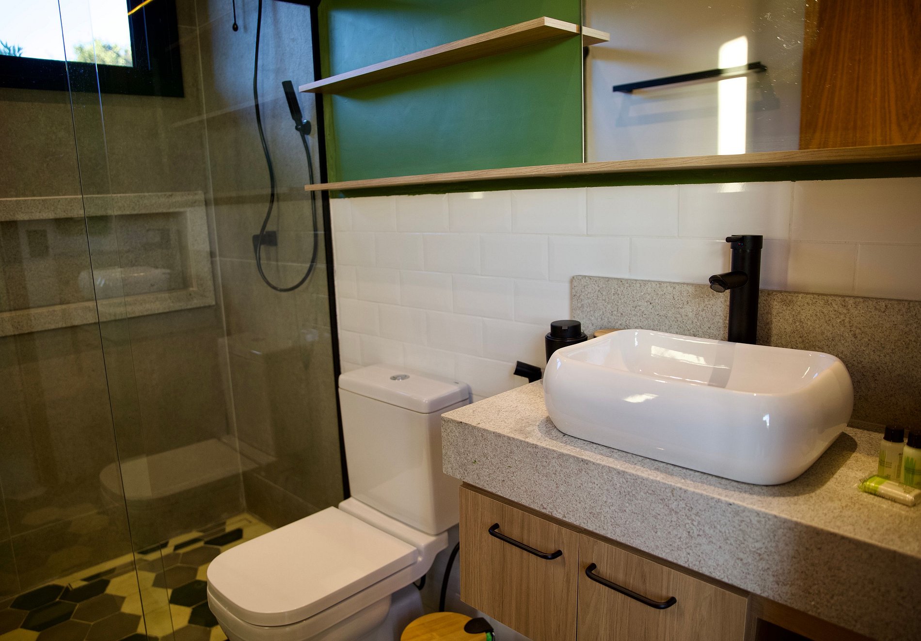 - Banheiro:Possui áreas molhada e seca juntas, com armários sob medida e chuveiro elétrico.
